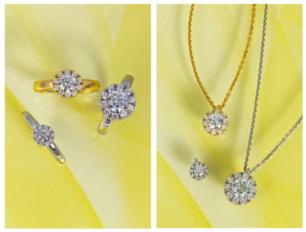 太陽のように輝く中石とその周りを囲ったまばゆいダイヤモンドがより輝きを引き立てる取り巻きスタイル。