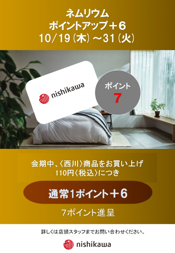 6階 西川ショップ〈ネムリウム〉では、10月19日(木)~31(火)の会期中、西川商品をお買い上げいただいたお客様に『ネムリウムメンバーズポイント』通常1ポイントにプラス6ポイント、合計7ポイントを進呈いたします。